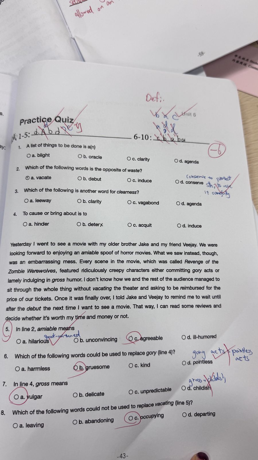 Q6 gory、Q7 gross、Q8 vacating 在阅读中都猜对了